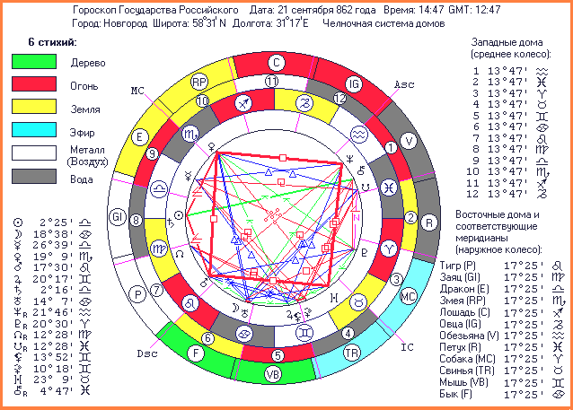 Я не ставлю задачу интерпретации и уж тем более подробного анализа. Отмечу только, что такого “богатства” потенций Руси, которое вырисовалось на приводимом Гороскопе Государства Российского, мне раньше не встречалось. Надеюсь, что коллеги со мной согласятся. Мне лично особенно понравился такой содержательный аспект этой карты, как соединение Сатурн-Солнце в 3-м градусе Весов в 8 Доме в знаке Зайца Восточного Зодиака (только об одном этом символе “свернутого в точку Западного Зодиака” можно написать целую книгу). Угловые Дома (по Д.Радьяру, выражающие дхарму) начинаются в фиксированных знаках (знаках концентрации-собирания), причем традиционную “скорпионью” преобразующую Цель мы можем (с позиций Востока) теперь уточнить как Цель, имеющую явные признаки “режиссера-постановщика” Сценариев Творца (символизм восточного знака Дракона). Аспектная конфигурация Большого Квадрата “задействует” (а значит, и причиняет основные связанные с их проявлениями “неудобства”) два Пути Гороскопа (в терминах Востока) – Путь Эа (Творца) и Путь Ану (Пространства). Отсюда вытекает естественность поиска гармонии на Пути Энлиля (Человека). Именно последнее обстоятельство принудительно-вынуждающе делало русских душевными всю их обозримую историю, даже несмотря на расширенное соединение Селена-Лилит-Юпитер на куспиде 5 Дома Детей.