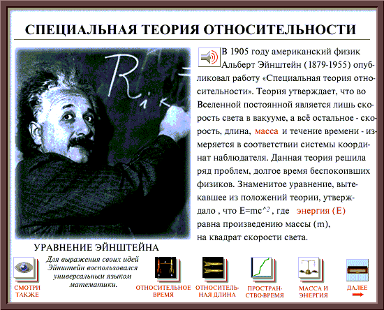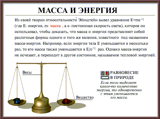 Пометки: Эта выдержка содержит ряд неточностей, допущенных, возможно, при переводе. На них я не останавливаюсь. Что же касается перехода (возможного) “массы-энергии” в тепловую энергию, то из “знаменитой формулы Эйнштейна” самой по себе такого вывода никак не следует. А вот что действительно следует, помятуя об основном постулате Эйнштейна о постоянстве скорости света, так это то, что отношение энергии тела к его массе есть величина постоянная, равная квадрату скорости света в вакууме. Эта величина вполне оправданно может называться постоянной Эйнштейна. Конечно, по одной только этой формуле ни о какой содержательной стороне понятий энергия, масса, скорость света не может идти речи.