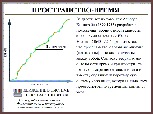 Пометки: Хочу обратить внимание на несколько моментов. Первое, что бросается в глаза, это возможность редукции привычного нам объема (трехмерного пространства) в линию (одномерное пространство). Хотя саму технологию такой редукции авторы не описывают, но приведенный выше график говорит сам за себя. Другой важный момент вот в чем. Введение понятия четырехмерной системы координат, или пространственно-временного континуума уже в чем-то отождествляет расстояние и время (метры и секунды) в силу уподобления вектора времени векторам длины, ширины и высоты. Чуть выше мы видели пример несколько иного, но подобного отождествления энергии и массы. Кстати, линия жизни выше приведенного графика очень напоминает изображение какой-либо дороги (или маршрута) на карте. Конечно, на линии жизни зависимость времени от расстояния не столь однозначна, как зависимость энергии от массы в “знаменитой формуле”. Но в одном можно не сомневаться, а именно: положение любой точки на линии жизни можно локализовать (обозначить) не только по оси пространства (или по трем осям длины, ширины и высоты), но и по оси времени. И последний интересный момент. Известно, что телескоп “изменяет” для наблюдателя расстояние до объекта. Может быть, учитывая пространственно-временной континуум, телескоп также “изменяет” и время?