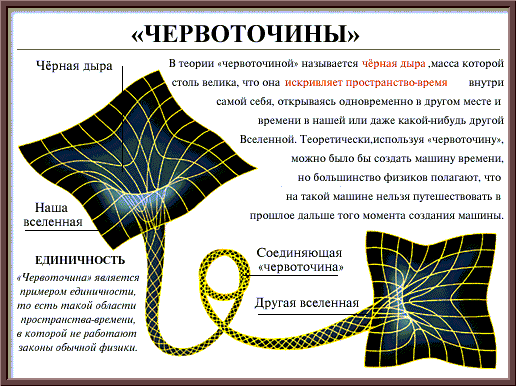 Пометки: Это – самое любимое мною место во всей энциклопедии. Потому что здесь я наконец-то начинаю испытывать облегчение и освобождение от осознанного и подсознательного протеста против того теоретического положения, что когда-то вся масса Вселенной находилась в объеме, сравнимом с точкой. Я наконец-то понимаю, что единичный точечный объект (в теории) на практике может соответствовать “входным воротам” в неведомую (надеюсь, только пока) нам Вселенную.