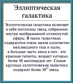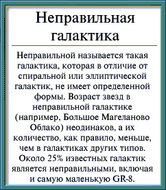 Пометки: Мне кажется, что неправильные галактики – более ранние стадии эволюции галактик вообще. Они просто моложе правильных. Различия же между спиралевидными и эллиптическими галактиками возникает из-за разного ракурса наблюдения за ними. Примерно так же, как возникает различие между профилем и фасом.
