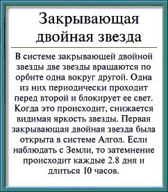 Пометки: Я понимаю, что здесь речь идет о каком-то циклическом процессе. Но безоговорочно согласиться с тем, что в данном случае одна звезда периодически закрывает другую, вокруг которой она вращается, не могу. Даже не производя никаких точных вычислений, я почти уверена, что в таком случае линейная скорость вращающейся звезды должна быть больше скорости света, что маловероятно.