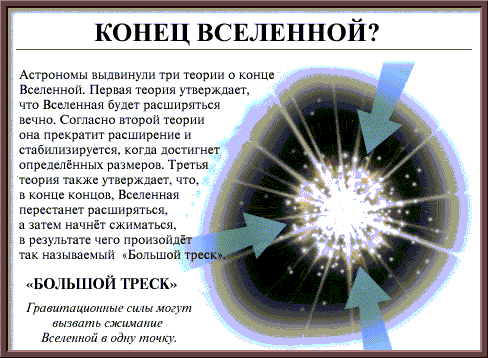 Пометки: “Большой треск” – это, конечно же, аналог “музыкального сопровождения” на похоронах Вселенной. Успокаиваться или останавливаться на таком “конце” означало бы, по-моему, соглашаться с моделью умирающей Вселенной. В смертной Вселенной и все смертно. Прощай, вечность! Прощай, спасение! Прощай, надежда (которая и навсегда умрет последней)! Кому как, а мне такая модель активно не нравится. Попытаюсь-ка я найти нечто получше.