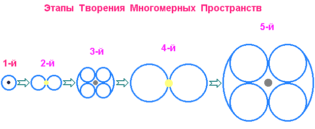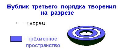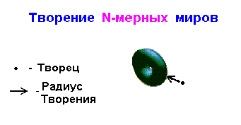 Все более мерные миры по внешнему виду – тоже бублики, только с более сложной внутренней структурой. Отсюда уже можно понять, что автор строит простейшие многомерные миры по аналогии с одномерным, или окружностью. Изюминка в том, что на каждом новом этапе “творения” вместо точки за элементарный мир берется мир на порядок меньший, чем мир “творимый”, причем эти элементарные миры (точнее их плоскости “творения”) ориентируются перпендикулярно к плоскости нового “творения” по радиусу нового “творения” и последовательно прибавляются-приумножаются до замыкания новой “творимой” мерности: