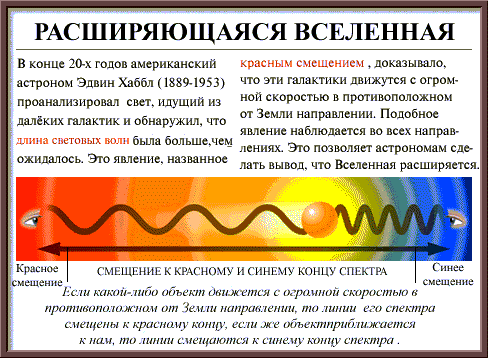 Пометки: Здесь я вижу пример чрезмерной экстраполяции (до вселенских размеров) частных истин или смешения причин и следствий. Что я имею в виду? У меня нет никаких возражений против того, что красное смещение (для земного наблюдателя) указывает на факт удаления Земли от всех других галактик, или всех других галактик – от Земли. Но почему этот факт должен означать обязательное расширение всей Вселенной? Поищем для наглядности более простые аналоги. Уподобим расширение Вселенной растяжению медицинского жгута. Если растягивать такой жгут, держась за его концы, то при определенных допущениях можно говорить о растяжении всего жгута. Ну, а если растягивать только какой-то один участок жгута? Считать ли, что при этом растягивается весь жгут (аналог расширения всей Вселенной)? Приведу другой пример. Все видели, как кипит вода или другая более вязкая жидкость. И отмечали, как при этом образуются, растут и лопаются затем пузырьки. Поместим наблюдателя в центр такого растущего пузырька. Предположим, далее, что этот наблюдатель обнаружил красное смещение всех внепузырных (запузырных) объектов. Вопрос: Правомерно ли будет заключение такого наблюдателя о расширении всей внепузырной (запузырной) жидкости? Скорее всего, нет. А ведь астрономы, сделавшие вывод о расширении Вселенной, находились примерно в тех же условиях, что и наблюдатель внутри пузыря.